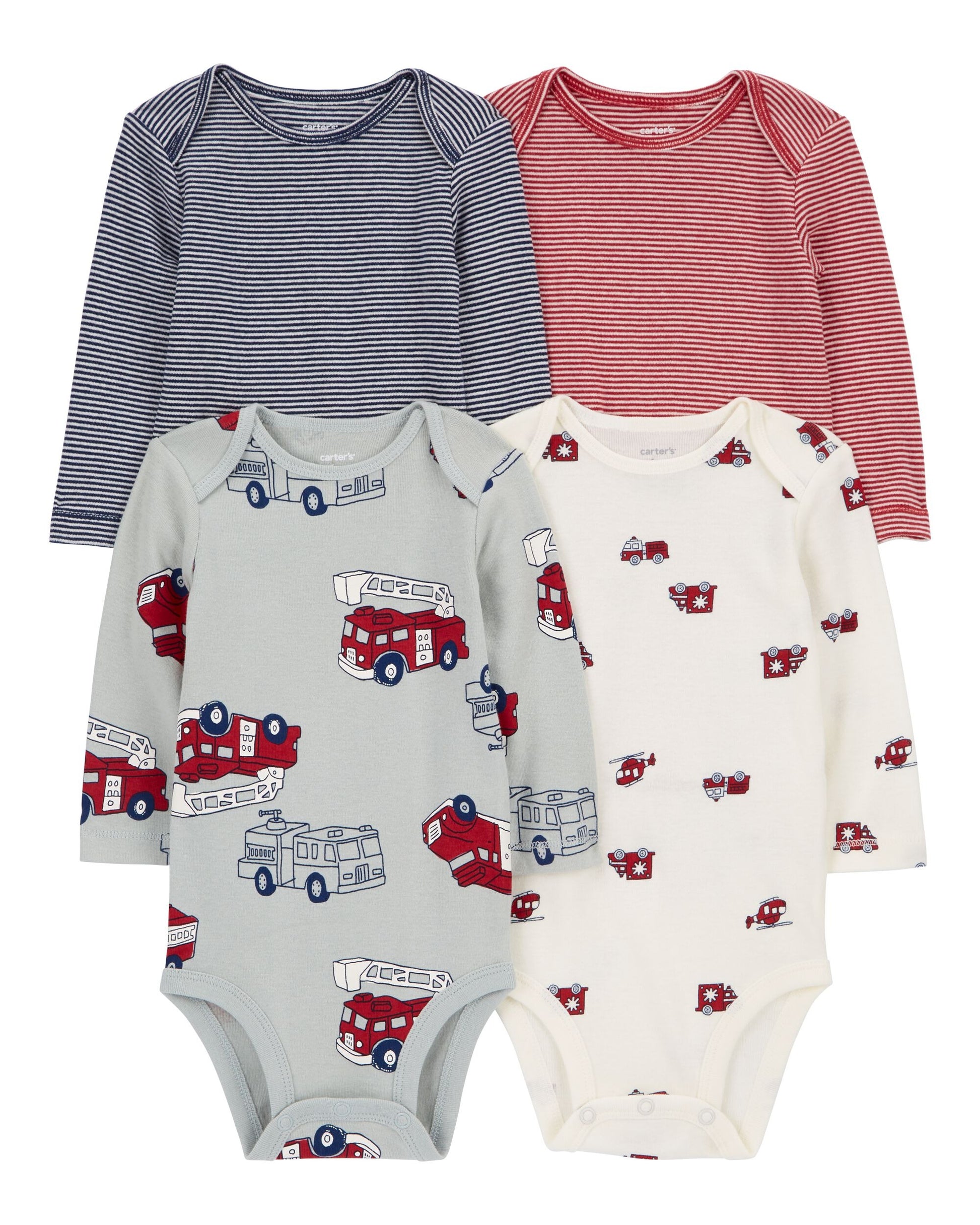 Confeccionados en algodón suave, estos bodies de manga larga vienen en un paquete de cuatro, con estampados coloridos.