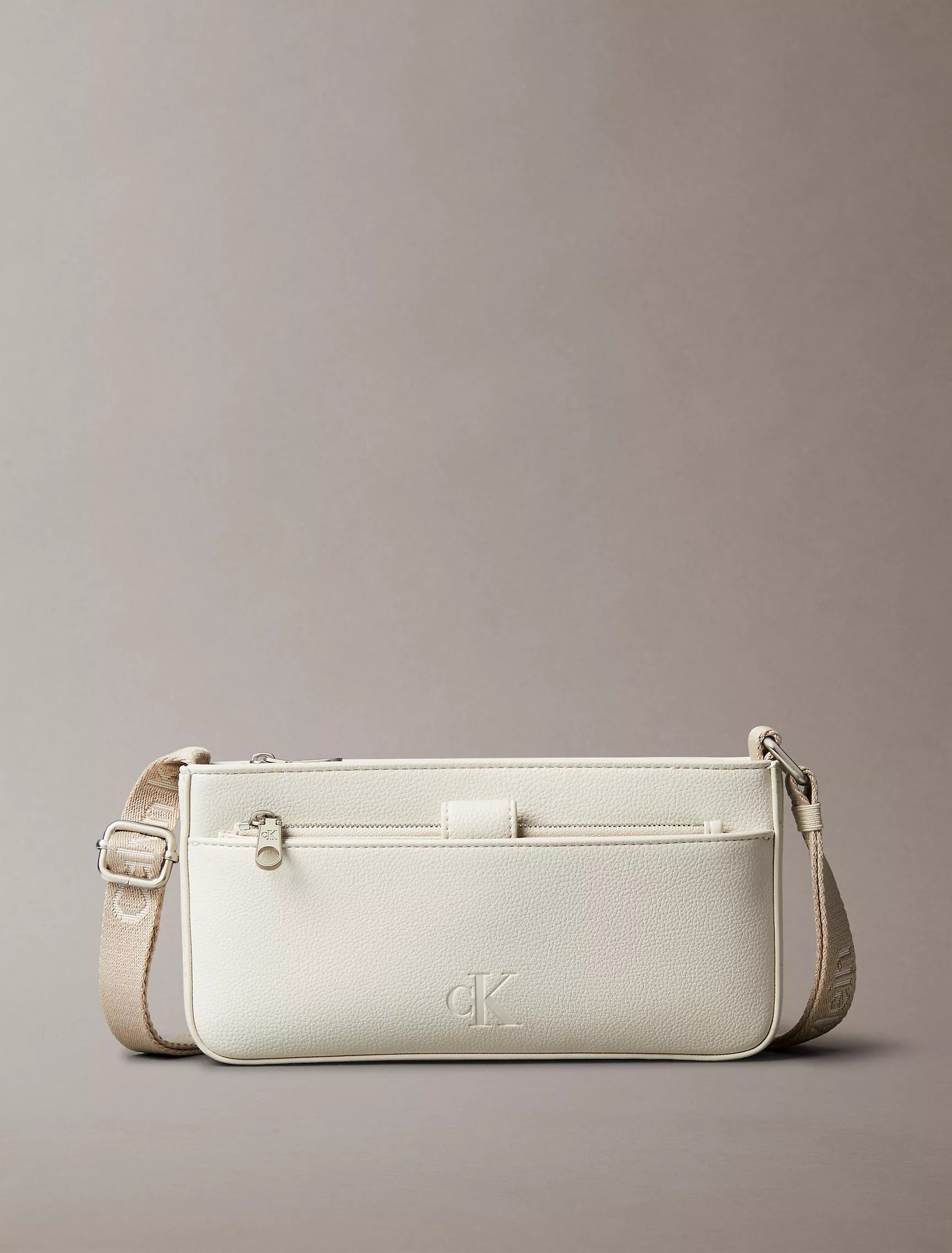 Confeccionado en 100 % piel sintética, este bolso bandolera está diseñado para guardar objetos esenciales compactos. Cuenta con cierre de cremallera en el compartimento principal y un bolsillo frontal. Incorpora una correa de hombro ajustable con detalles de logotipos repetidos de Calvin Klein.