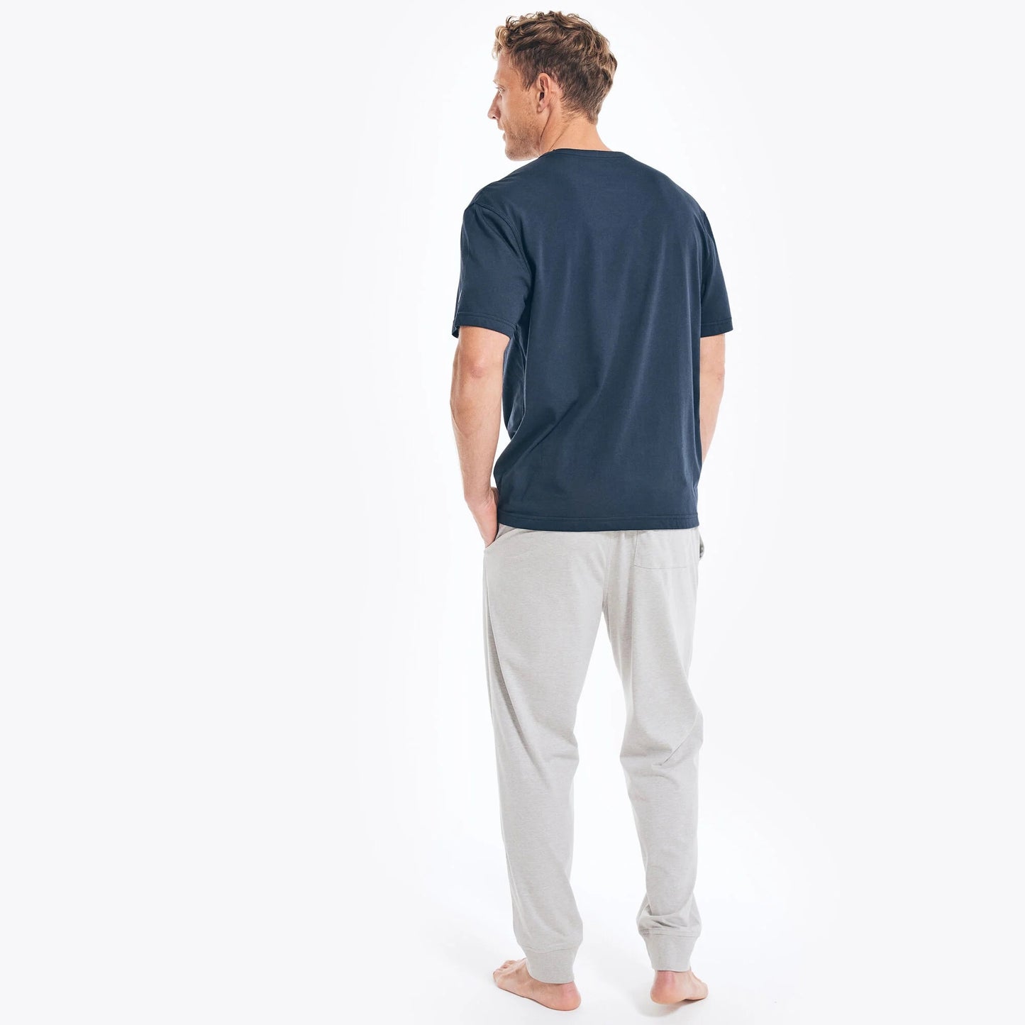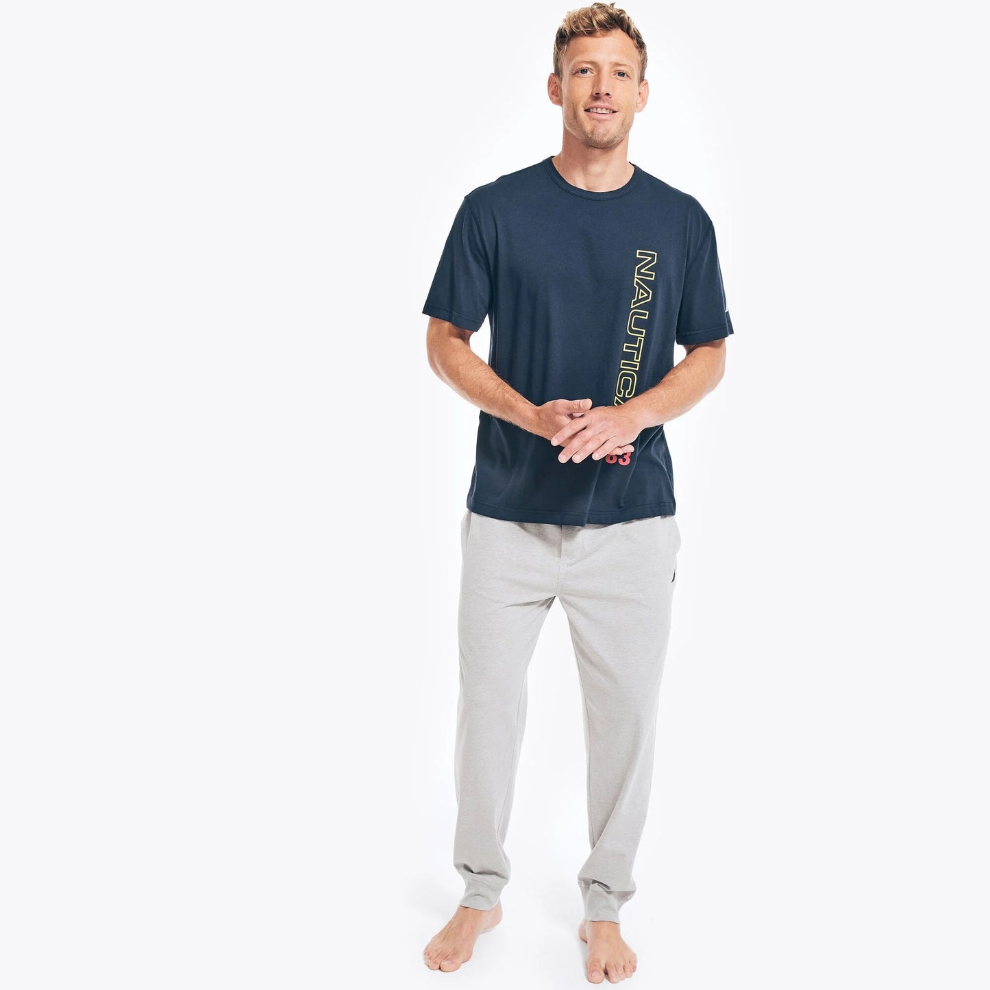 Este conjunto de pijama confeccionado con jersey de algodón transpirable se siente suave y fresco sobre la piel para mantenerte cómodo durante la noche. Con un corte vintage, presenta una camiseta de manga corta con cuello redondo y logo y pantalones sencillos con cordón elástico y bolsillos.