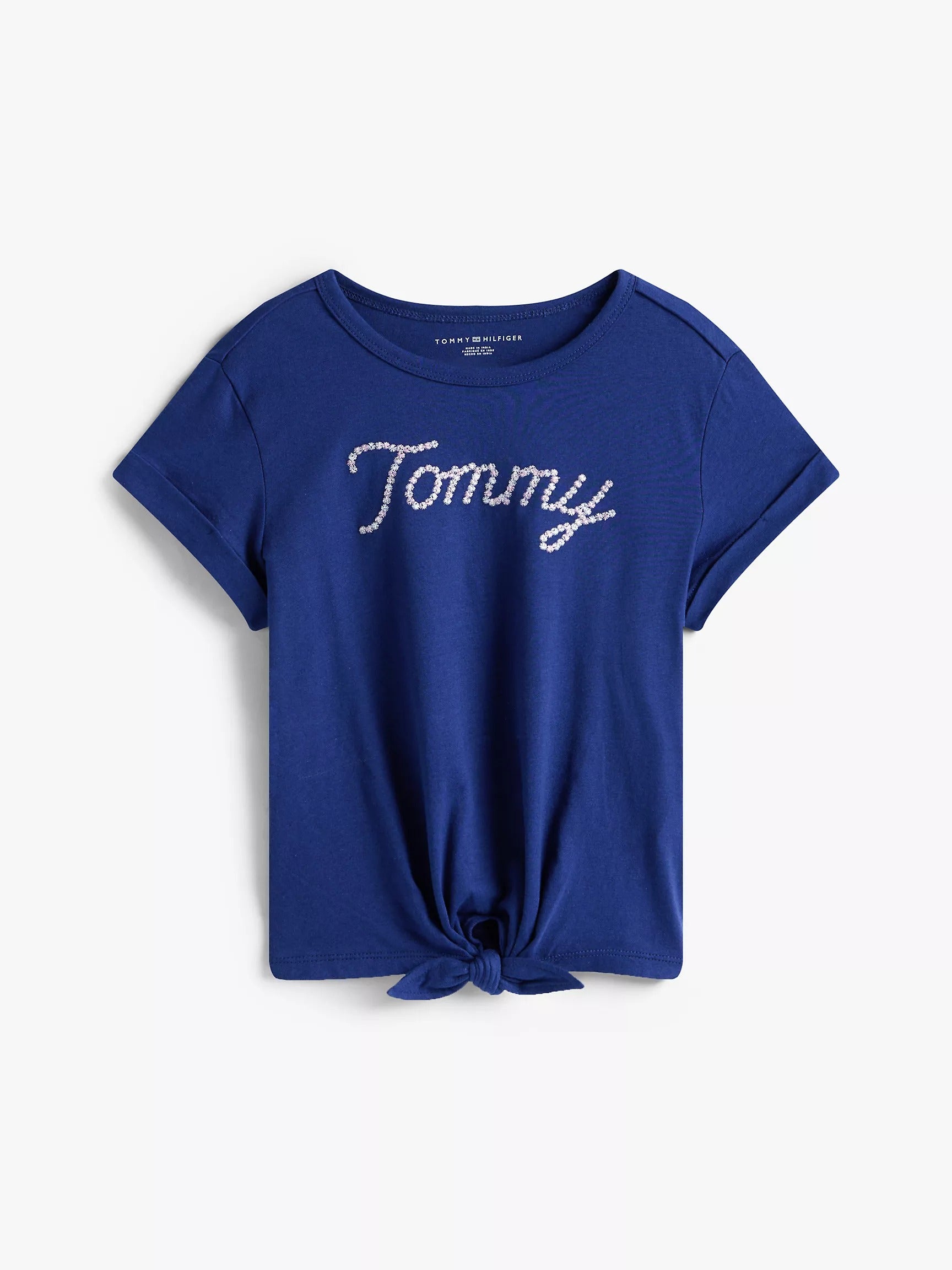 Franela con lentejuelas y nudo bajo para niña