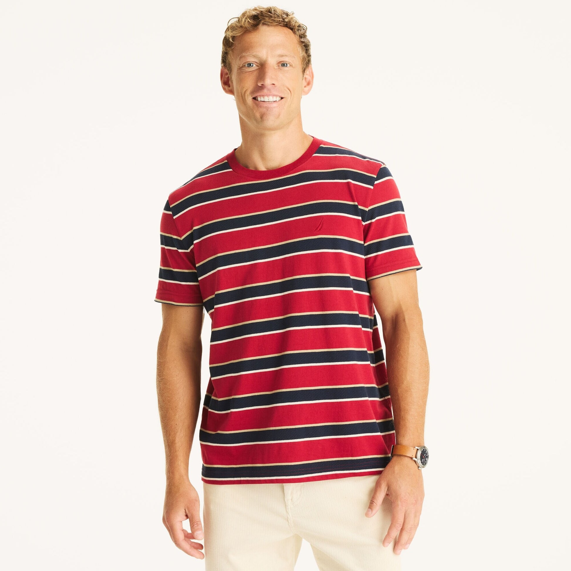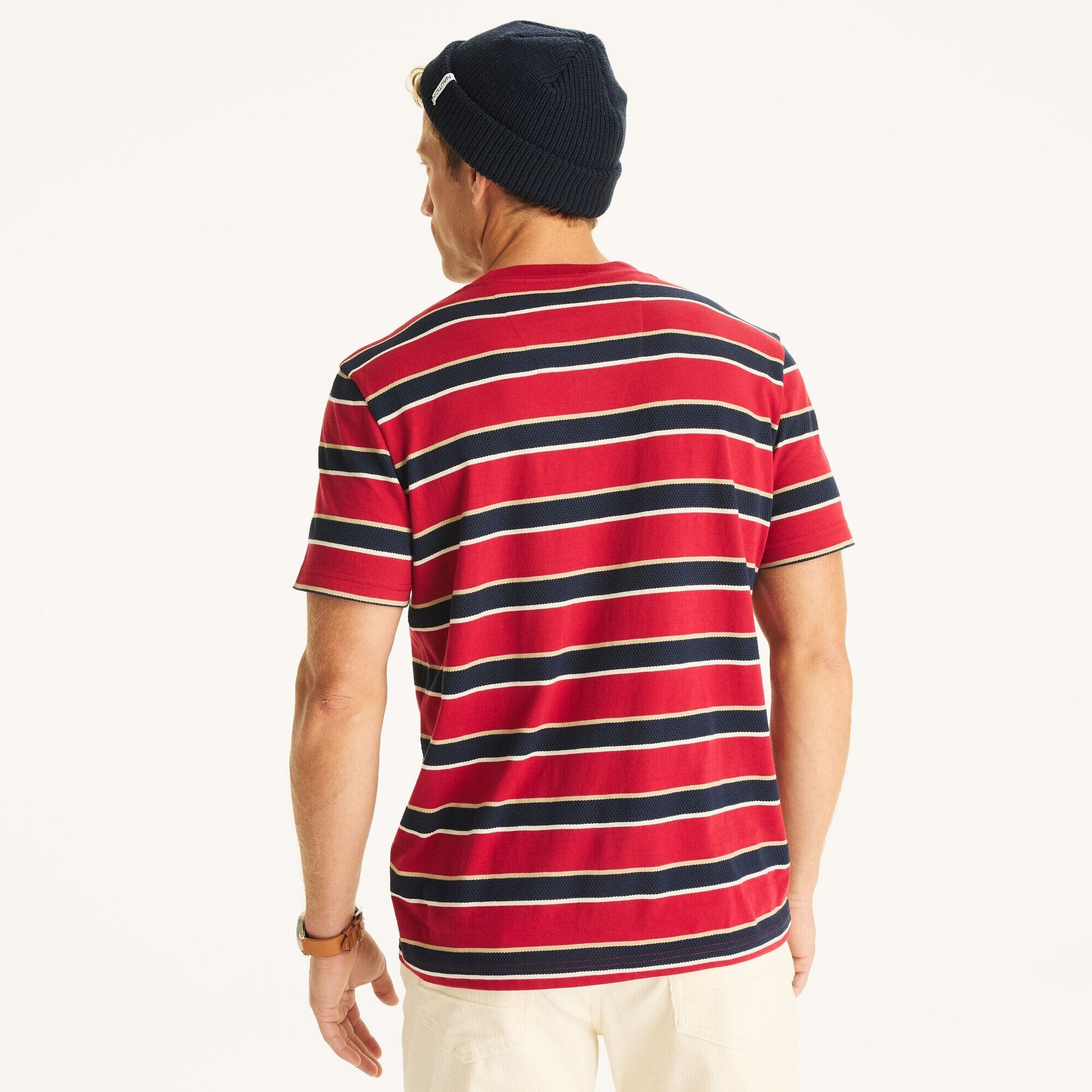 Confeccionada en punto de algodón teñido en hilo de forma sostenible, esta camiseta de cuello redondo presenta un diseño a rayas y nuestro logo en el pecho.