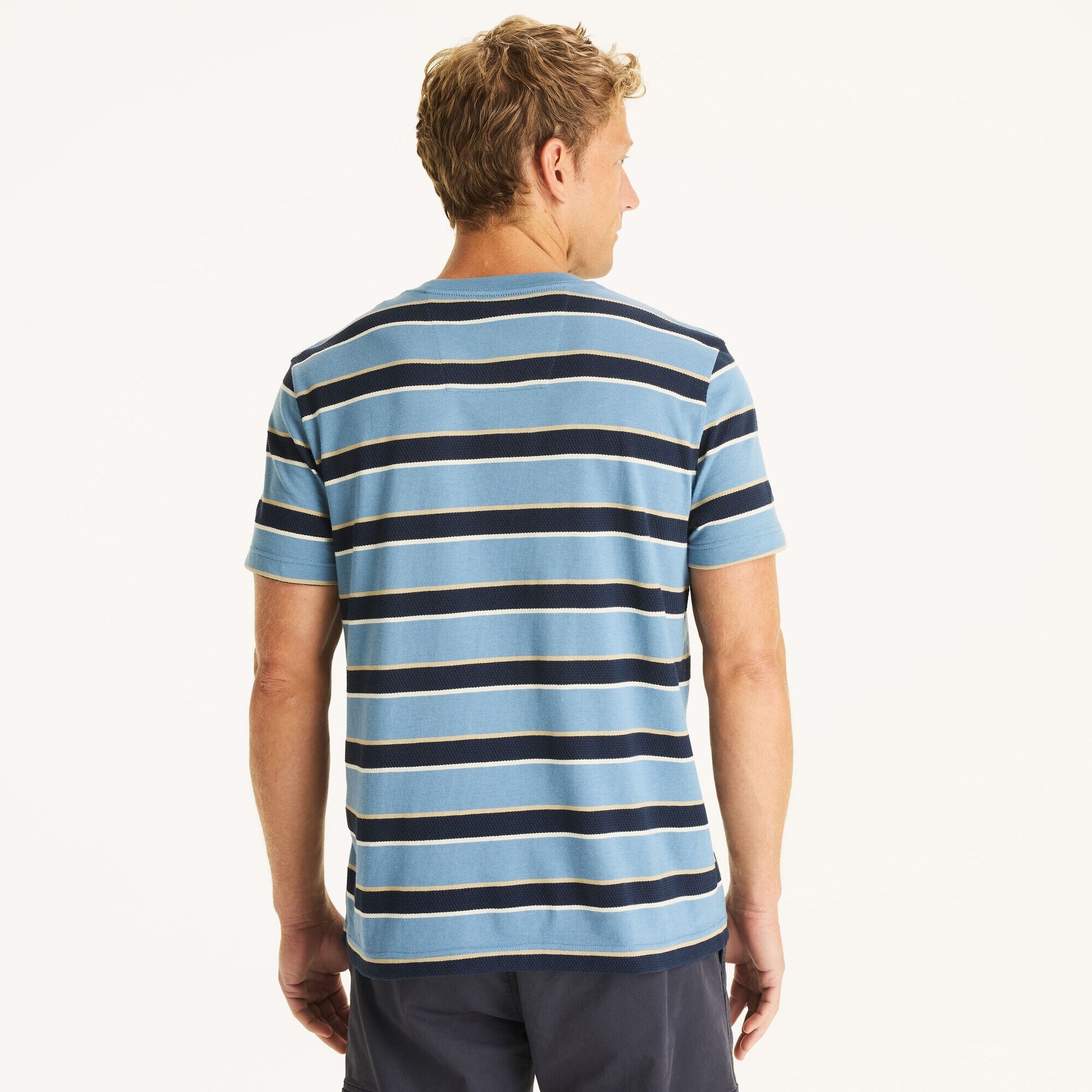 Confeccionada en punto de algodón teñido en hilo de forma sostenible, esta camiseta de cuello redondo presenta un diseño a rayas y nuestro logo en el pecho.