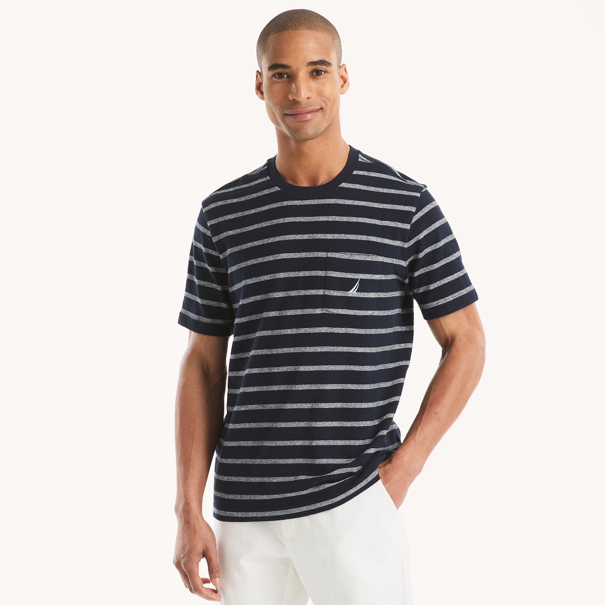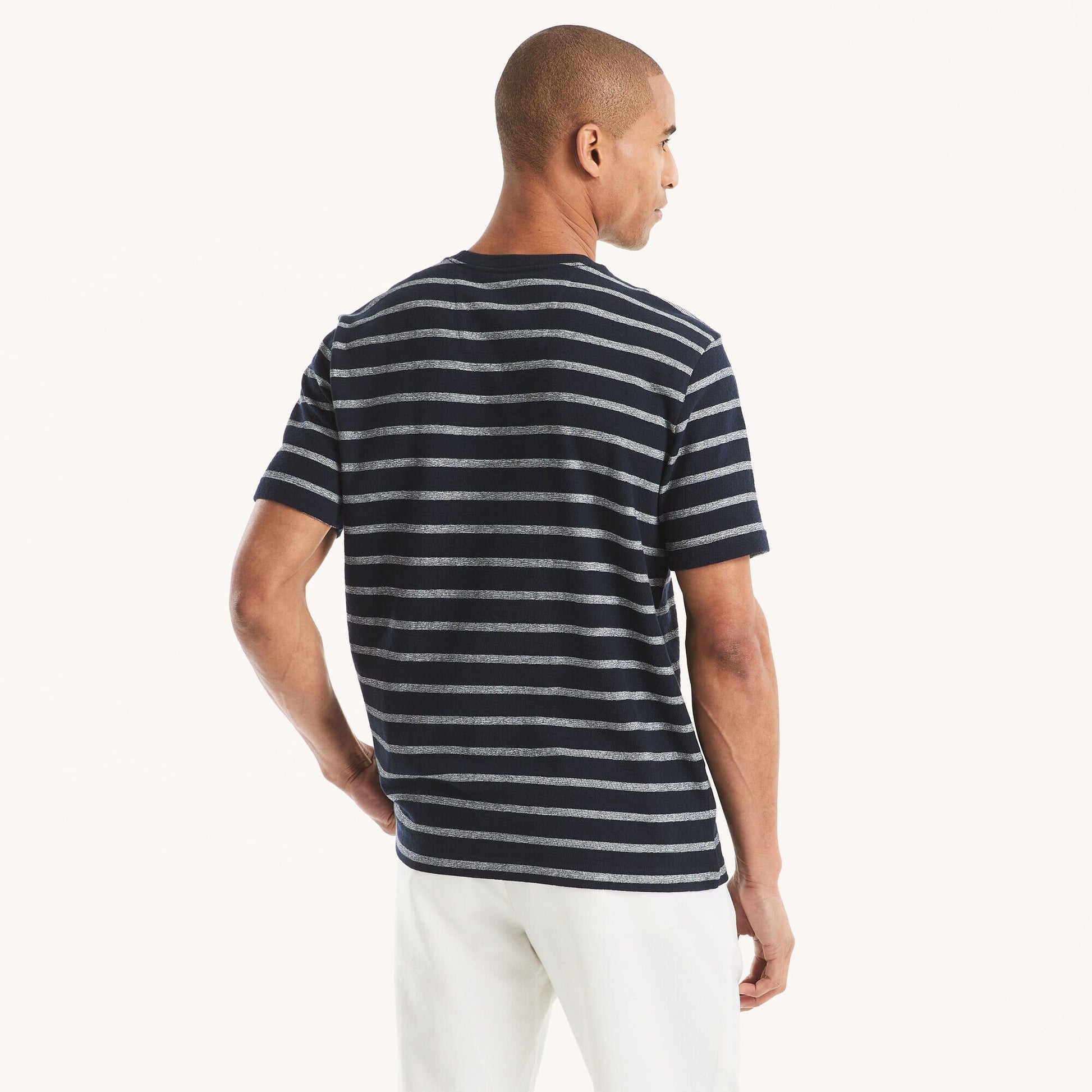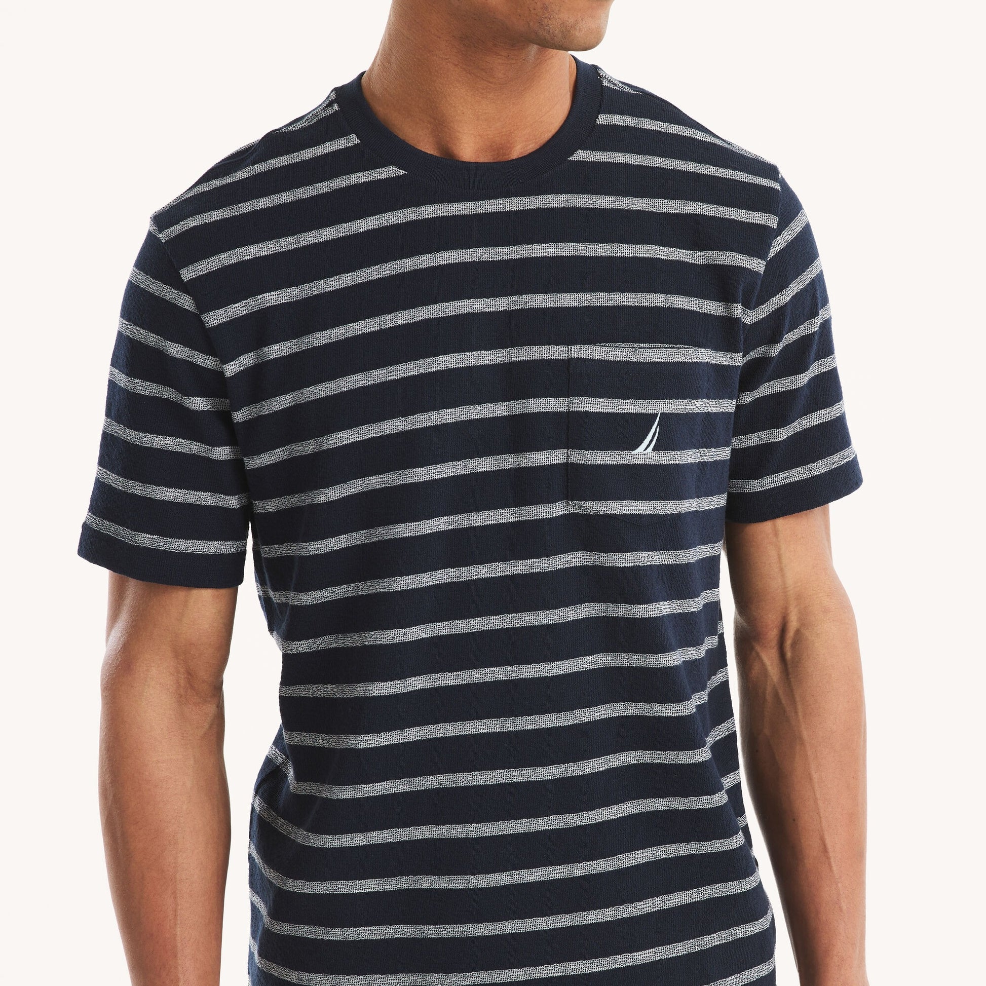 Confeccionada en punto de algodón teñido en hilo de forma sostenible, esta camiseta de cuello redondo presenta un diseño a rayas y nuestro logo en el pecho.