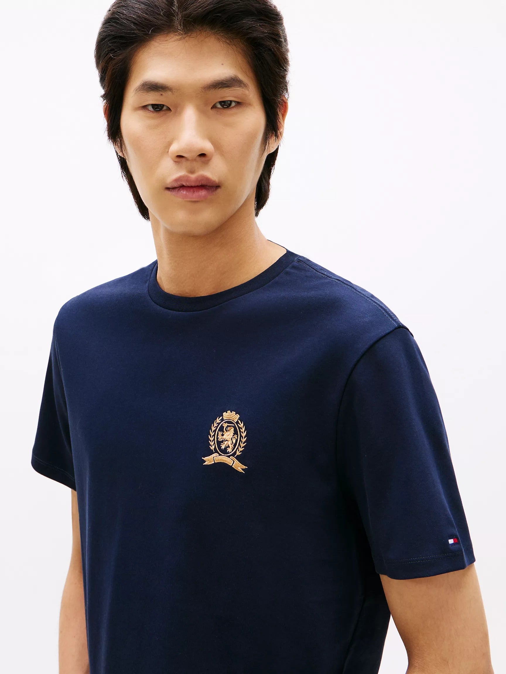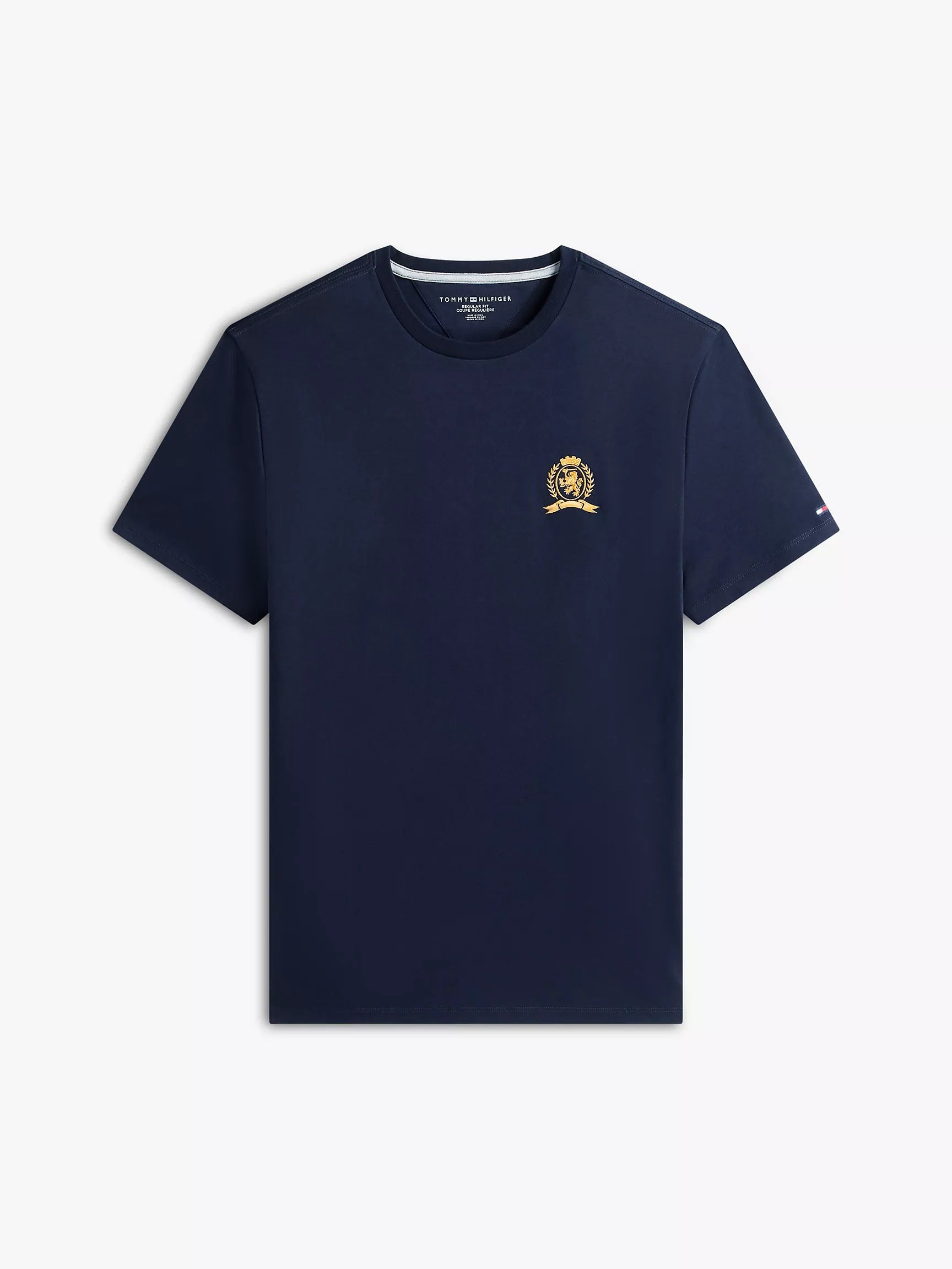 • Cuello redondo, manga corta, logotipo del escudo bordado en tono dorado.