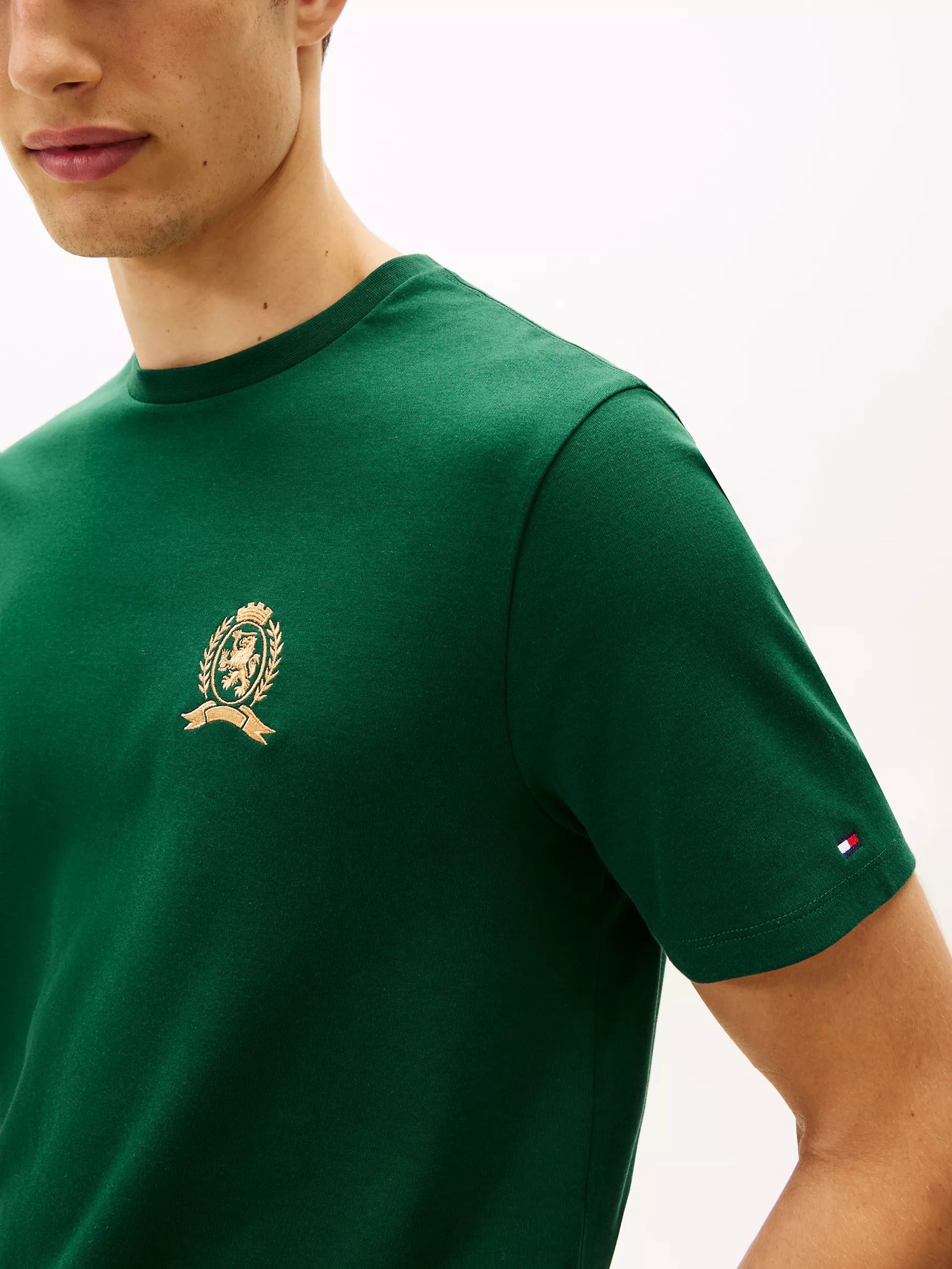 • Cuello redondo, manga corta, logotipo del escudo bordado en tono dorado.