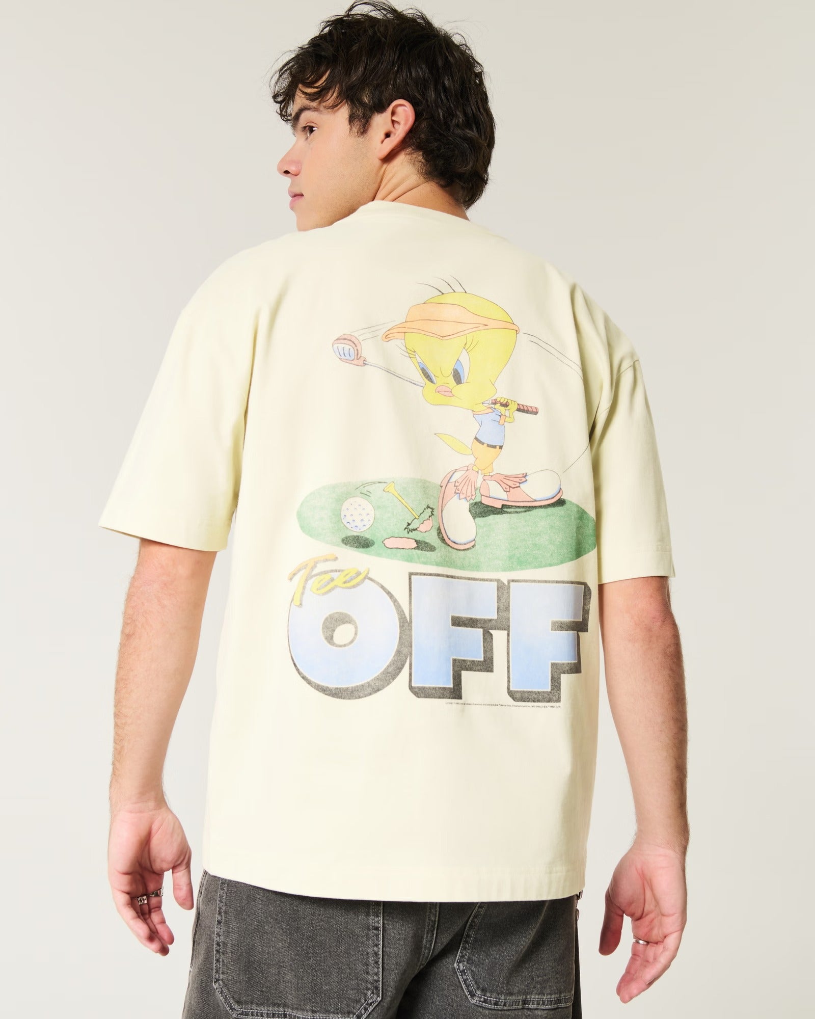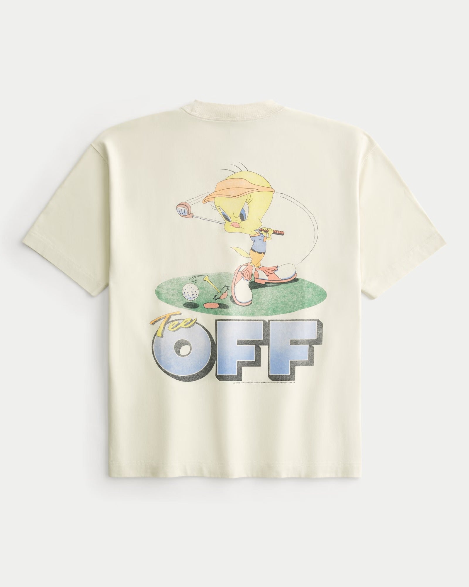Esta camiseta ultracómoda está confeccionada con algodón 100% supersuave y de peso pesado y presenta gráficos estampados de Tweety Tee Off con licencia oficial de Looney Tunes en el lado izquierdo del pecho y en la espalda. Cuello redondo, mangas cortas. Corte cuadrado. Artículo importado.