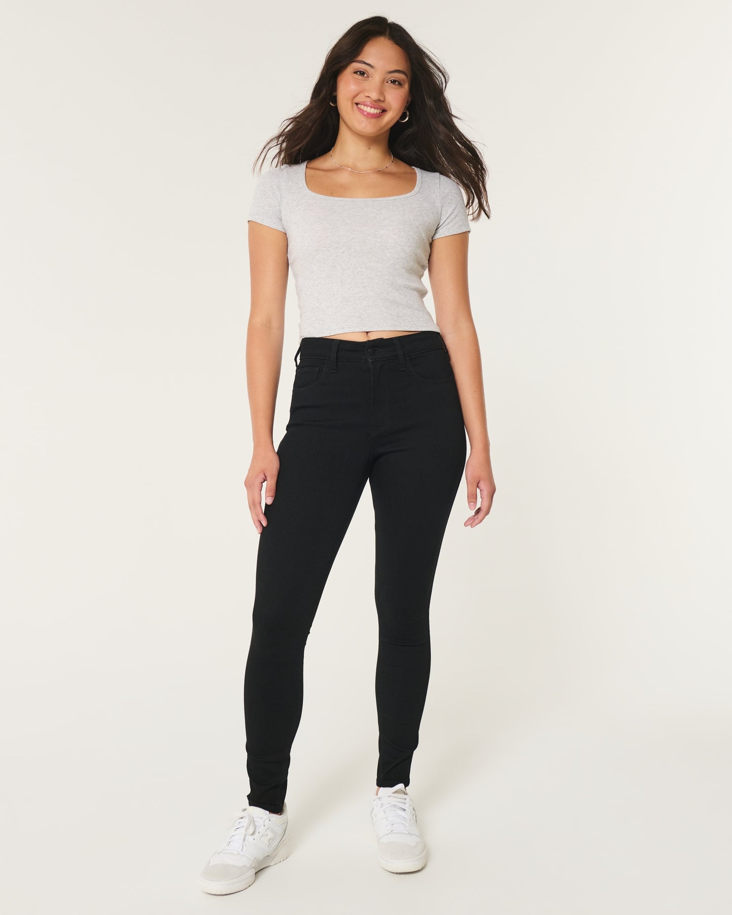 Diseñados con nuestro exclusivo corte suelto, estos jeans superajustados negros con curvas tienen una cintura de tiro alto elastizada. Artículo importado.