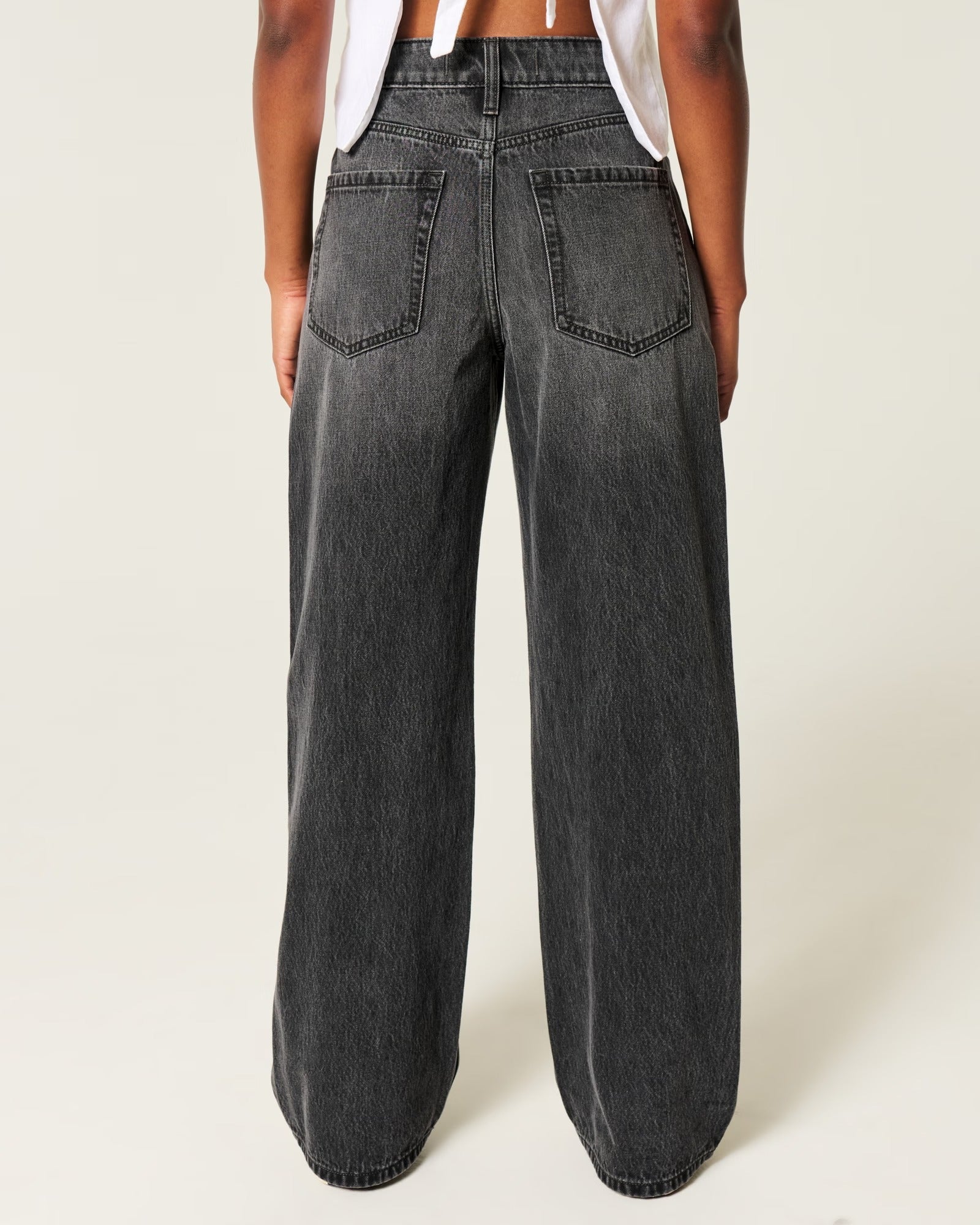Jeans cómodos de denim diseñados con una favorecedora cintura de tiro alto y pernera holgada. Lavado en negro con decolorado y con arrugas decoloradas. Artículo importado.
