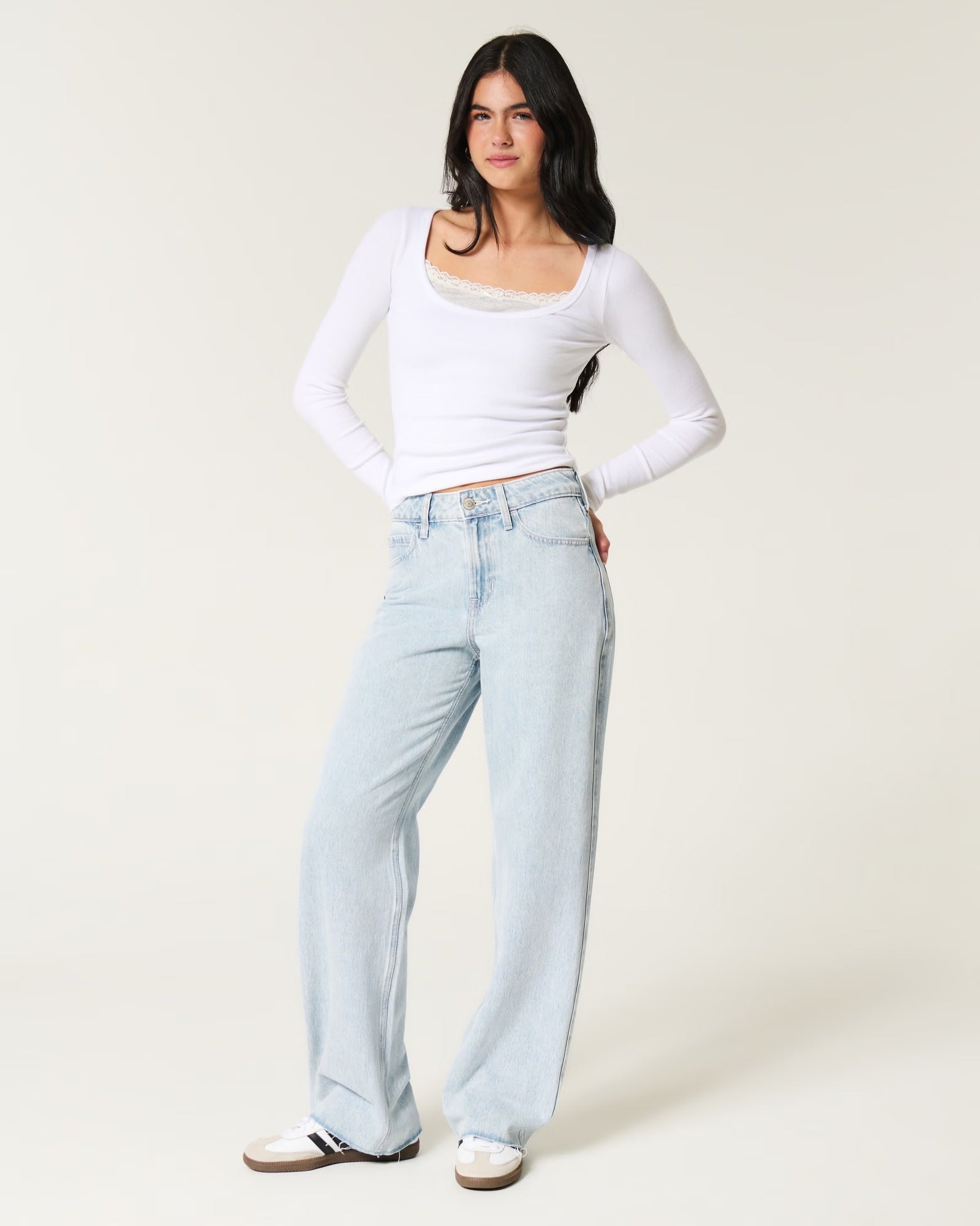 Lindos y cómodos jeans en lavado claro, diseñados con una favorecedora cintura de tiro alto y pernera holgada. Artículo importado.