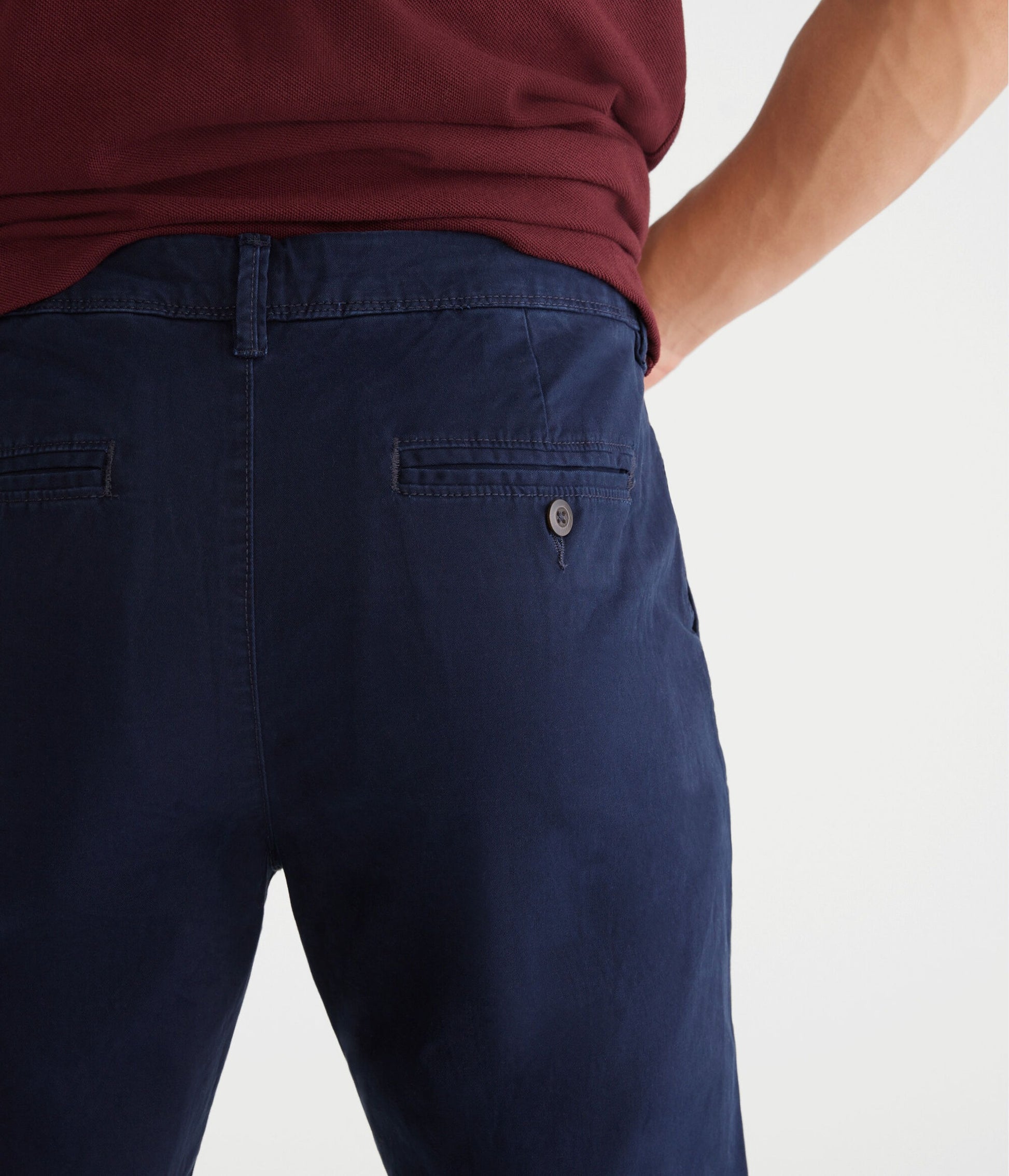 • Bolsillos delanteros en ángulo | bolsillos traseros de ribete con botón
