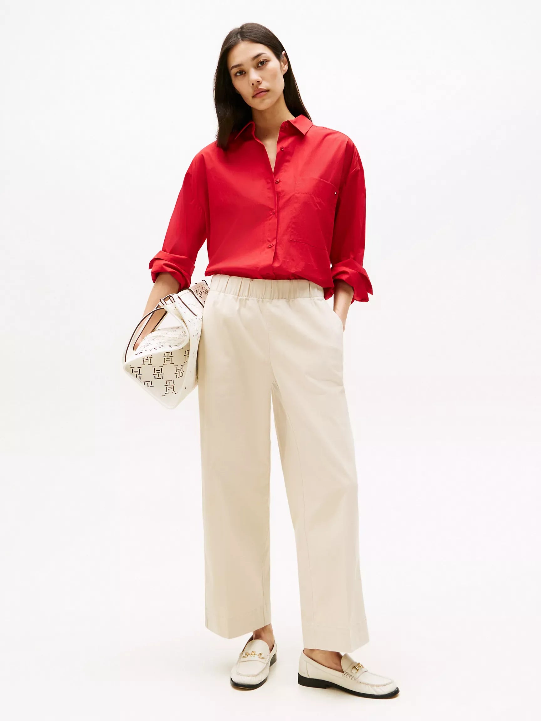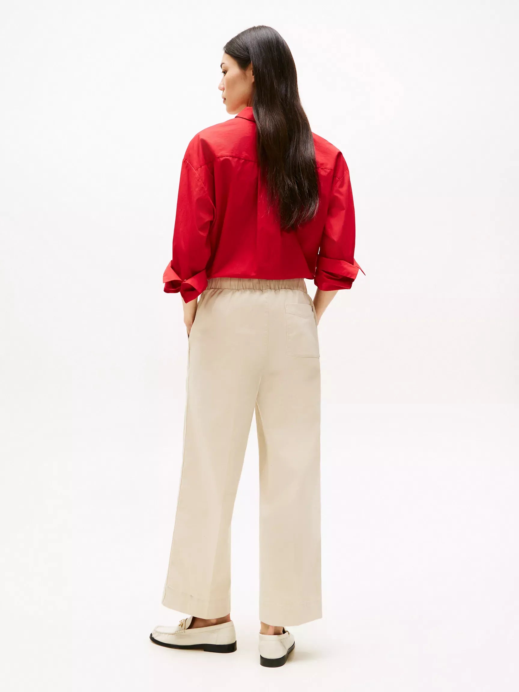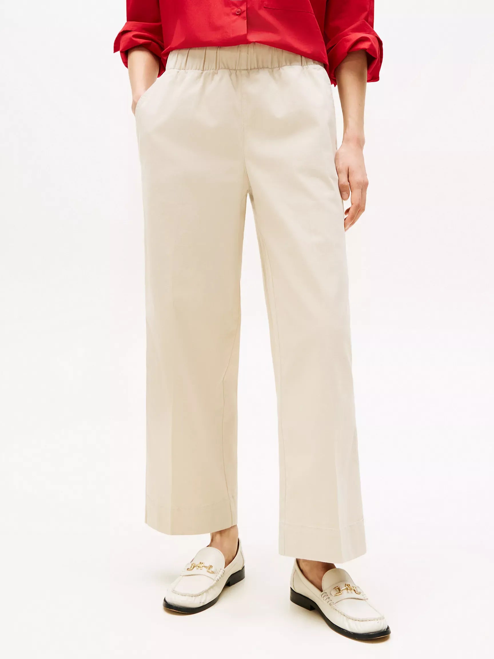 Pantalón de mujer Tommy Hilfiger. Este pantalón de pierna ancha aporta un toque chic y desenfadado a tu armario. Nuestra última versión llega al tobillo e incorpora una cómoda cintura elástica para ponértelo fácilmente.