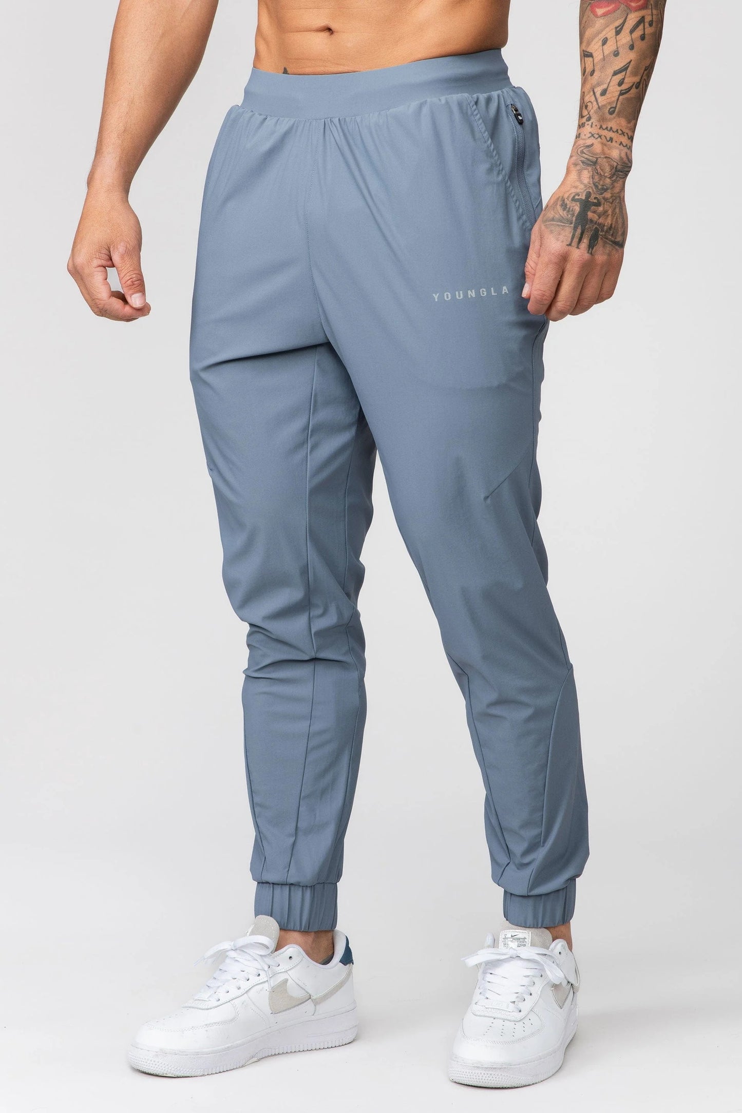 Los pantalones deportivos de nailon están confeccionados con un tejido de poliamida y elastano superligero y elástico. Incluyen cintura y puños elásticos, dos bolsillos laterales y un bolsillo con cremallera detrás del bolsillo principal, y un logotipo de YoungLA estampado en cinta reflectante.