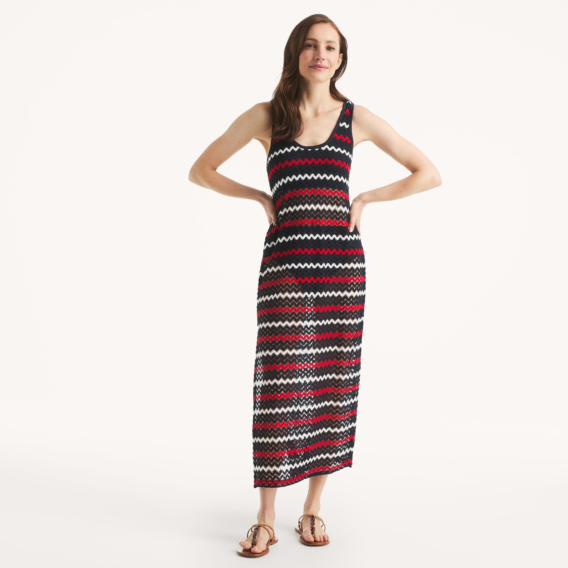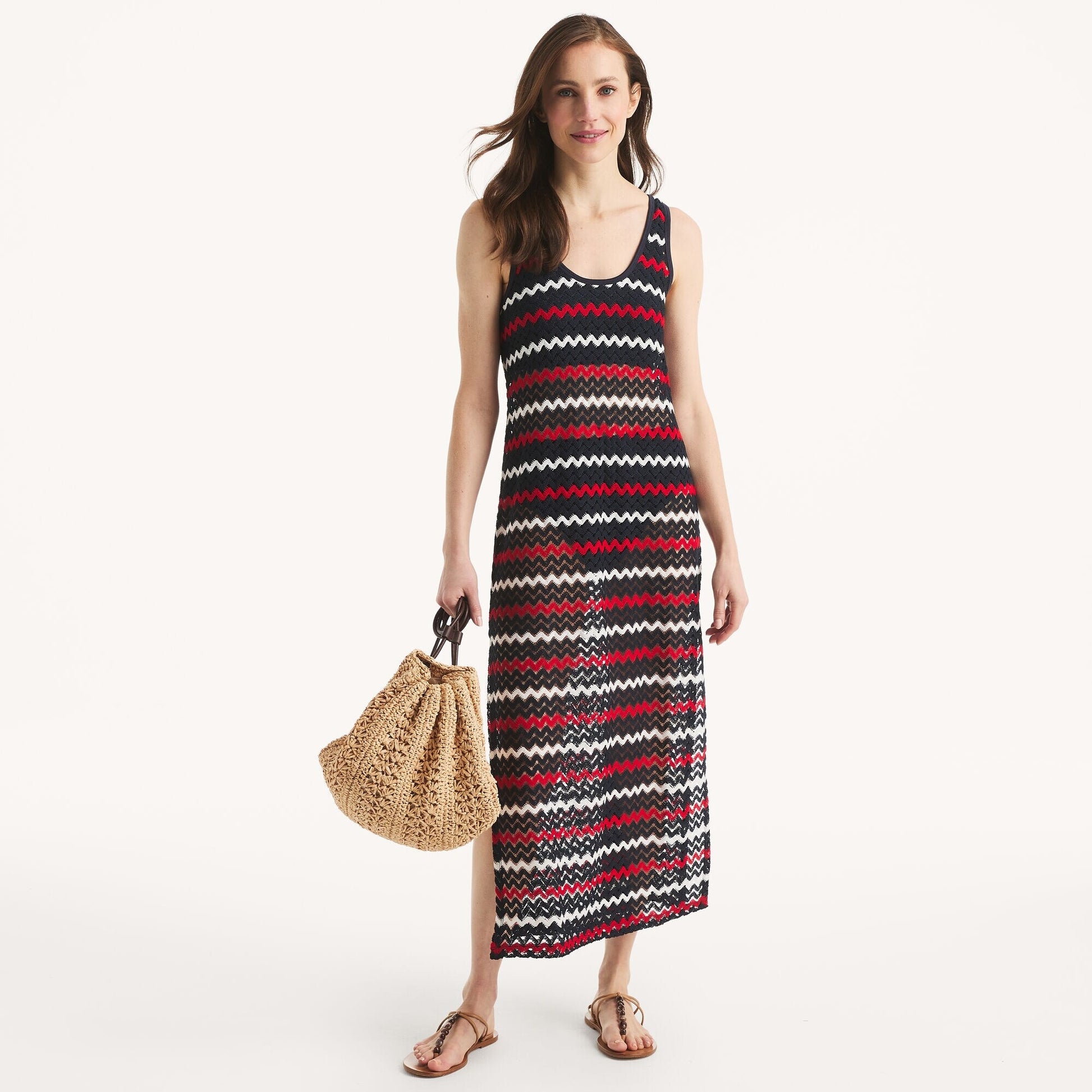 De la piscina a la playa con este vestido largo de crochet. Con un diseño a rayas, es perfecto para los días cálidos.
